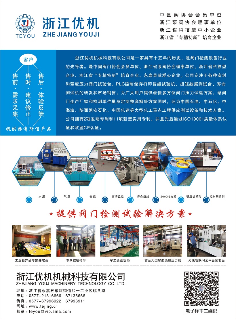 浙江優(yōu)機(jī)機(jī)械科技有限公司憑借研發(fā)投產(chǎn)的智能集成密封液壓機(jī),成功入榜浙江省先進(jìn)制造業(yè)首臺(tái)套企業(yè)名單,浙江優(yōu)機(jī)機(jī)械科技有限公司多個(gè)產(chǎn)品通過國(guó)家閥門(浙江)檢測(cè)中心檢測(cè),相關(guān)技術(shù)經(jīng)浙江省省級(jí)工業(yè)新產(chǎn)品新技術(shù)鑒定,擁有2項(xiàng)發(fā)明專利和11項(xiàng)新型實(shí)用專利,是浙江省泵閥協(xié)會(huì)理事單位、浙江省“專精特新”培育企業(yè)、浙江省專利示范企業(yè)、浙江省科技創(chuàng)新型企業(yè)、溫州市科技創(chuàng)新企業(yè)、永嘉縣百星企業(yè)、永嘉縣愛心企業(yè)、中國(guó)石油準(zhǔn)入供應(yīng)單位、中國(guó)寶豐能源準(zhǔn)入供應(yīng)單位、山東核電設(shè)備有限公司合格供應(yīng)商。