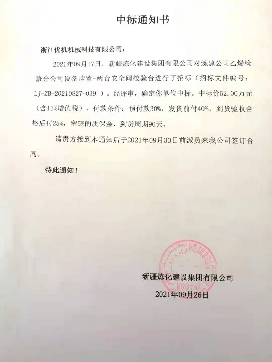 近期,新疆煉化建設(shè)集團(tuán)有限公司發(fā)出中標(biāo)通知書(shū),宣布通知浙江優(yōu)機(jī)機(jī)械科技有限公司,二次添加設(shè)備購(gòu)置項(xiàng)目-兩套安全閥校驗(yàn)臺(tái),經(jīng)評(píng)審確定中標(biāo)(招標(biāo)文件編號(hào):LJ-ZB-20210827-039),合計(jì)一期和二期閥門(mén)檢測(cè)校驗(yàn)設(shè)備總數(shù)達(dá)到11臺(tái)(套)金額貳佰多萬(wàn),該項(xiàng)目是浙江優(yōu)機(jī)機(jī)械科技有限公司主營(yíng)產(chǎn)品進(jìn)入中石油樣本項(xiàng)目。