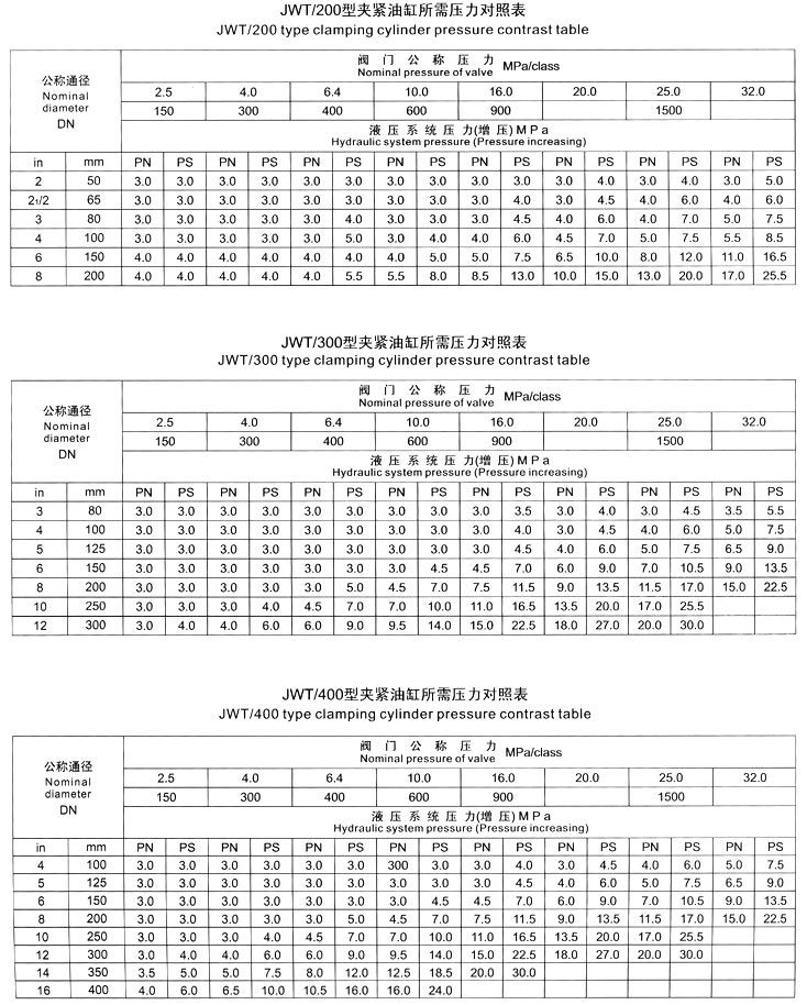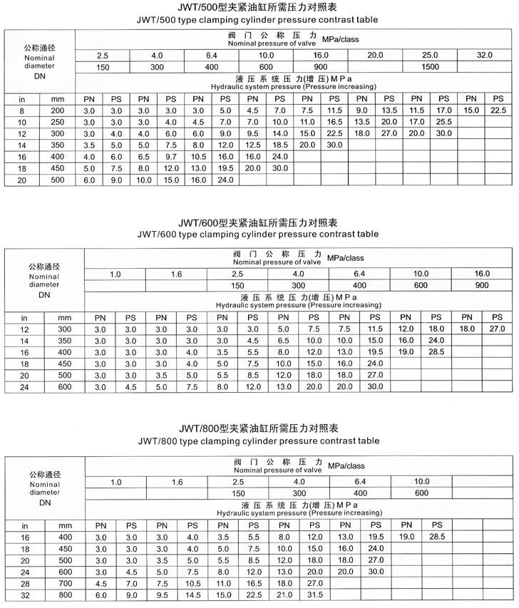 根據(jù)被試閥門公稱通徑和公稱壓力,調(diào)節(jié)電接點(diǎn)壓力表和被試閥門壓力相同。參照《壓緊油缸所需壓力對(duì)照表》將壓緊油缸壓力增壓到所需壓力要求。 (注:增壓按鈕可要多次點(diǎn)動(dòng),每次按動(dòng)相隔時(shí)間需在5-10秒鐘左右)。