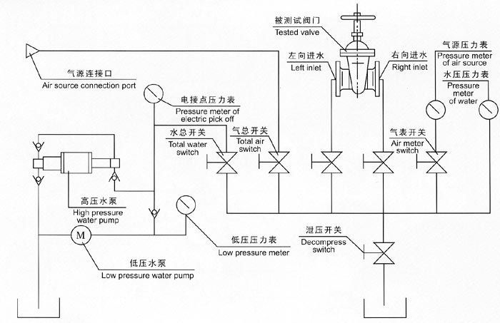 六、液壓供壓水泵開(kāi)始工作前,先調(diào)節(jié)好電接點(diǎn)壓力表與被試驗(yàn)閥門壓力相同,然后進(jìn)行工作。